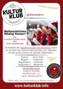 Im Rahmen der Manderscheider Adventsfenster laden wir herzlich ein! Eintritt und Getränke frei. Spenden für den guten Zweck wie jährlich willkommen.