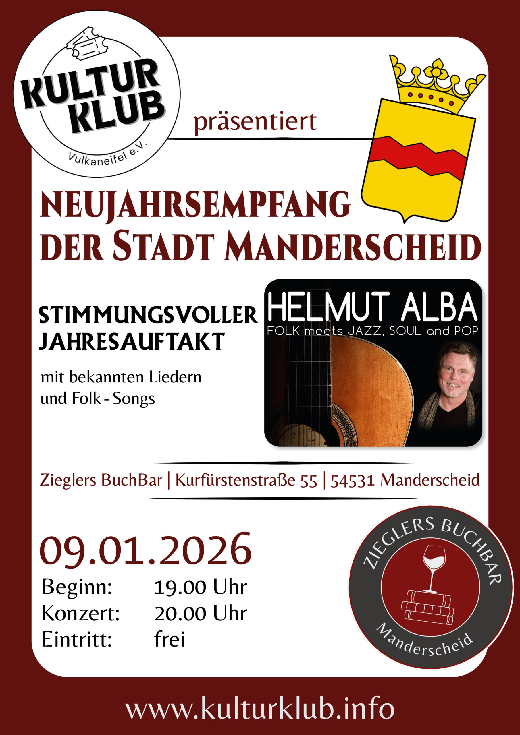 NEUJAHRSEMPFANG DER STADT MANDERSCHEID Nach den Grußworten durch die Bürgermeisterin im Rahmen eines Sektempfanges und eines kommunikativen Zusammenseins hat die Stadt Manderscheid Helmut Alba zu einem Konzert eingeladen. Helmut Alba - Vocal Coach und musikalischer Tausendsassa mit breitem Repertoire von weiterlesen...